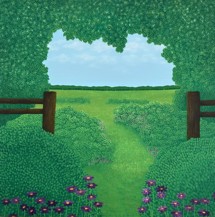 This collection from the solo show ‘Petal After Petal’ presents a personal journey told through oil on canvas. Each painting weaves together florals and landscapes — some are real places, others exist only in the imagination.