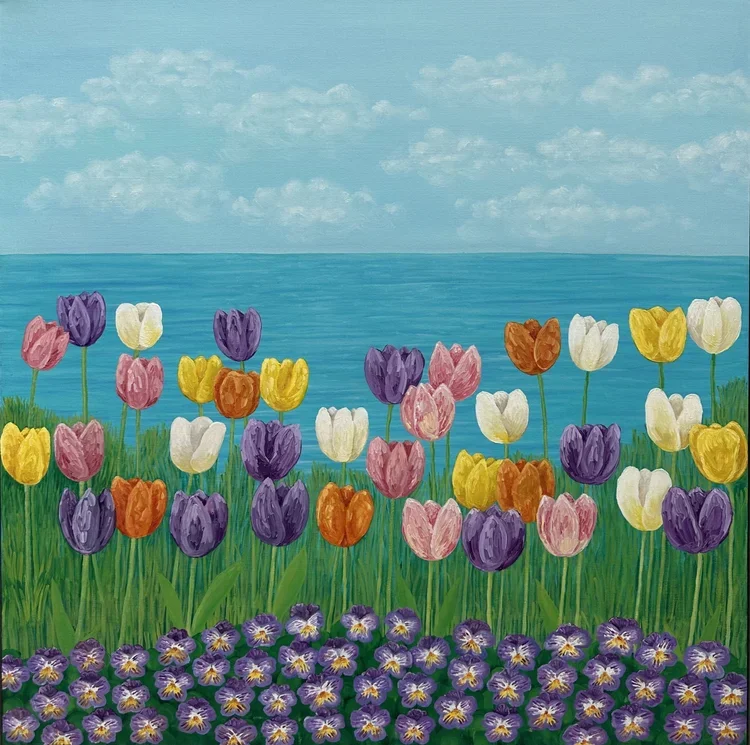 Through the Tulips, Oil Paint on Canvas, 102 x 152cm, $1100